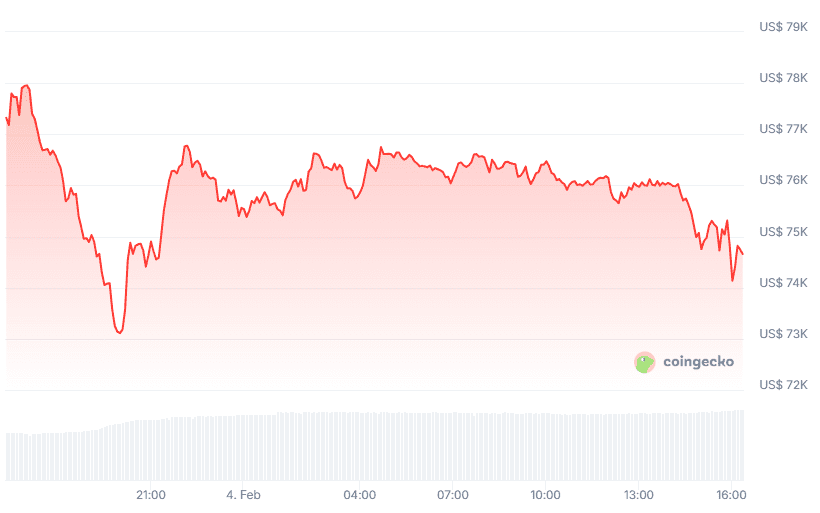 El valor total de todas las criptomonedas ha caído un 4,3% en las últimas 24 horas, situándose en 2,59 billones de dólares. Muchas monedas acumulan pérdidas semanales superiores al 10%. Bitcoin, la mayor criptomoneda, cotiza en torno a los 74.500 dólares, lo que supone una caída del 4,6% en un solo día. En el conjunto de la semana, el valor ha bajado un 17%.