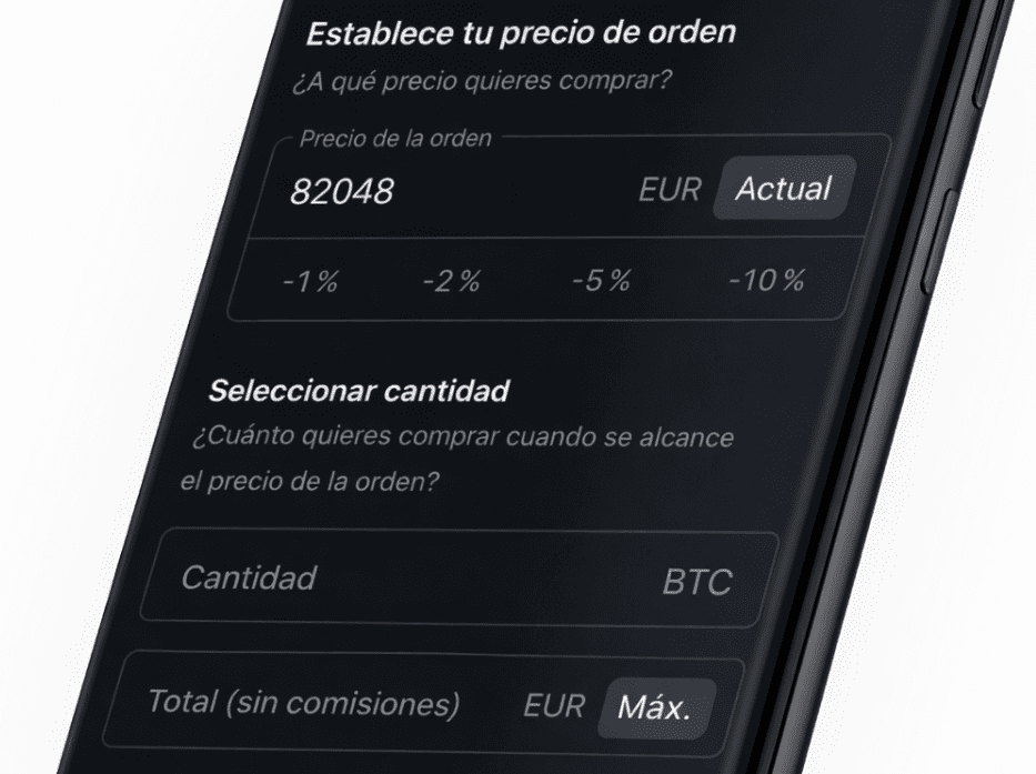 Además, puedes ahorrar en costes de negociación colocando tus propias órdenes en el libro de órdenes. Por ejemplo, si quieres comprar bitcoin, puedes elegir entre una orden de mercado o una orden limitada. En el primer caso, Bitvavo compra automáticamente al mejor precio disponible. En una orden limitada la puedes introducir tú mismo.