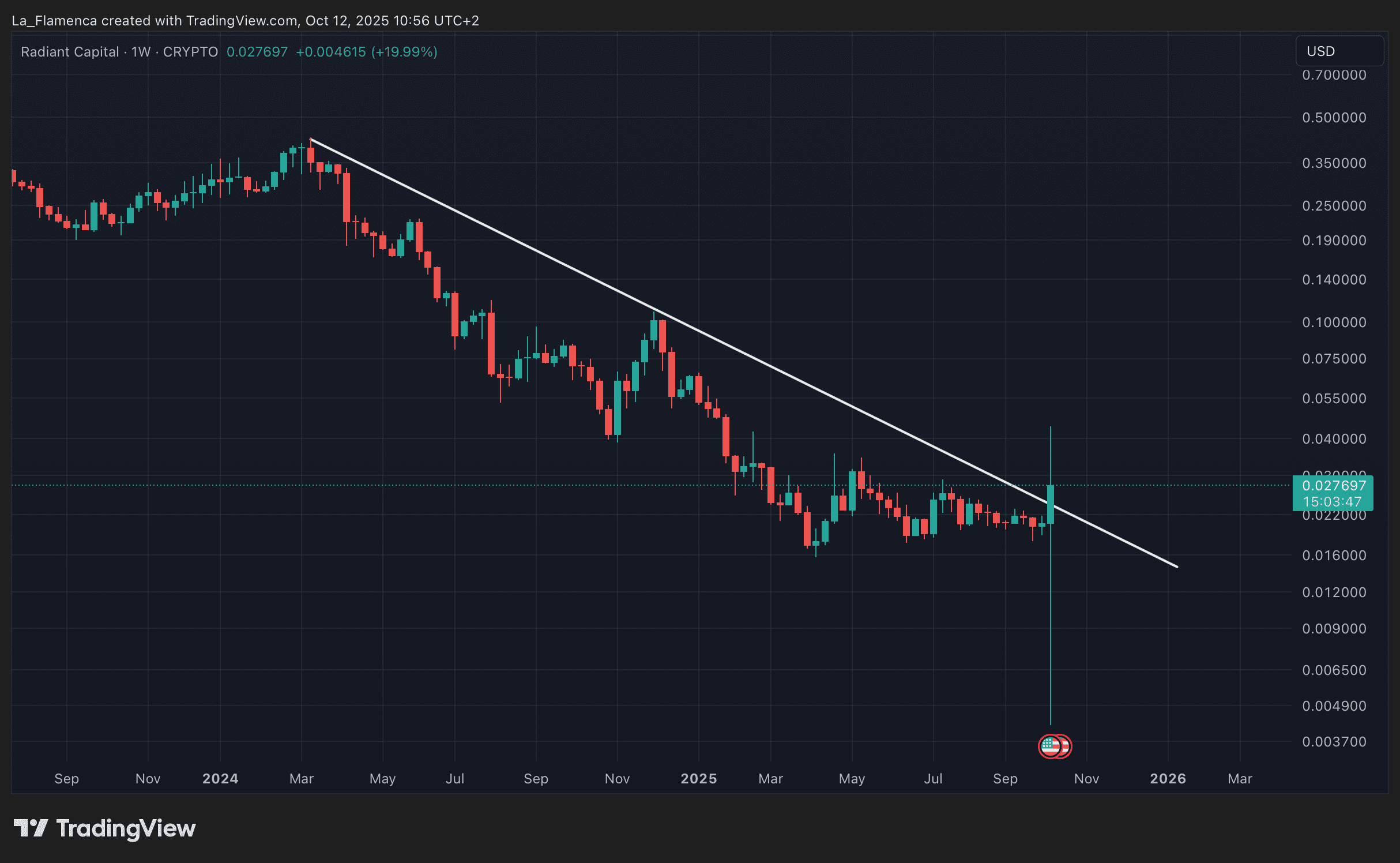 El viernes por la noche, la criptomoneda Radiant cayó más de un 80 % en menos de dos horas. Sin embargo, esto duró poco.