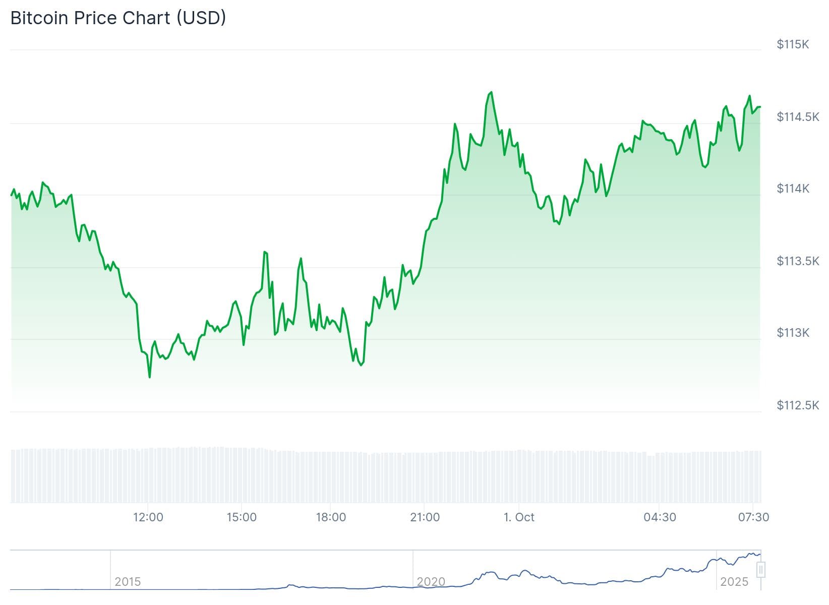 El precio del bitcoin es actualmente solo ligeramente superior al de hace 24 horas. Sin embargo, la mayor criptomoneda cayó ayer dos veces por debajo de los 113.000 dólares, lo que supone una diferencia considerable con respecto al nivel actual de aproximadamente 114.700 dólares.