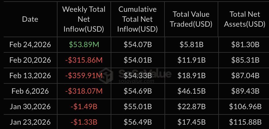 Es la primera vez en seis semanas que las entradas en los ETF de bitcoin superan a las salidas. En las semanas anteriores, salían de los fondos más de 300 millones de dólares por semana. En las dos últimas semanas de enero, la salida conjunta ascendió a unos 2.400 millones de euros.