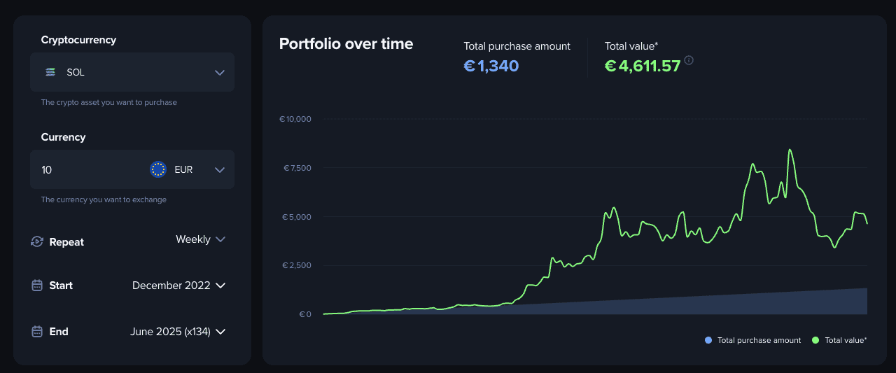 La plataforma cuenta con una función que permite aplicar esta estrategia automáticamente: en vez de iniciar sesión cada semana o mes para comprar solana, Bitvavo lo hace por ti.